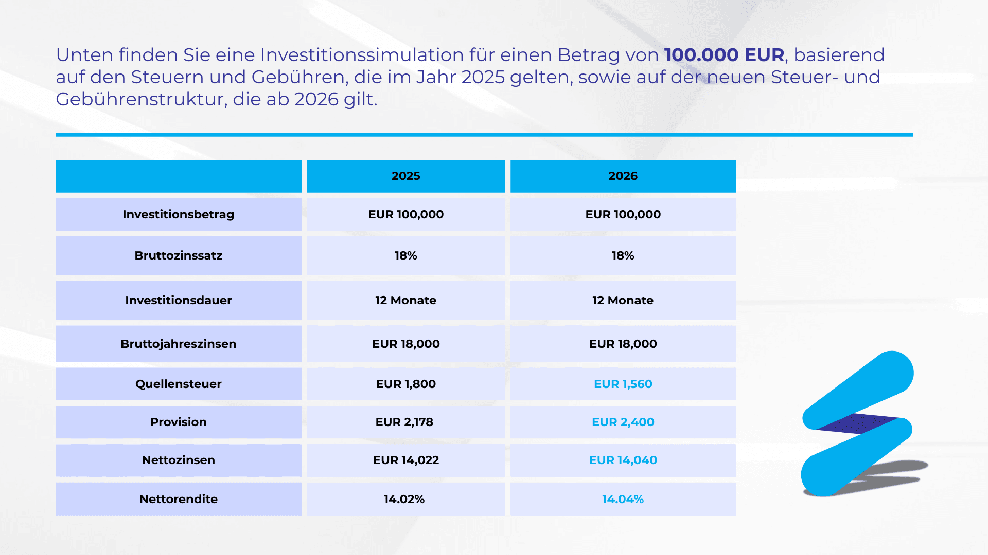 Quellensteuer auf den Nettzins. Die Quellensteuer von 10 % wird ab 2026 auf Basis der Bruttozinsen abzüglich der Stock.estate-Gebühr berechnet – nicht mehr auf den gesamten Bruttobetrag wie im Jahr 2025. Die Plattform berücksichtigt diese Anpassung automatisch in den monatlichen Berechnungen und Berichten.